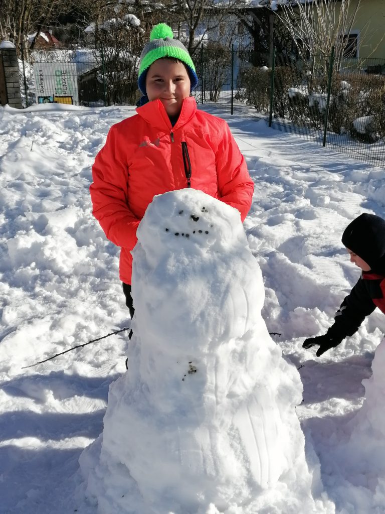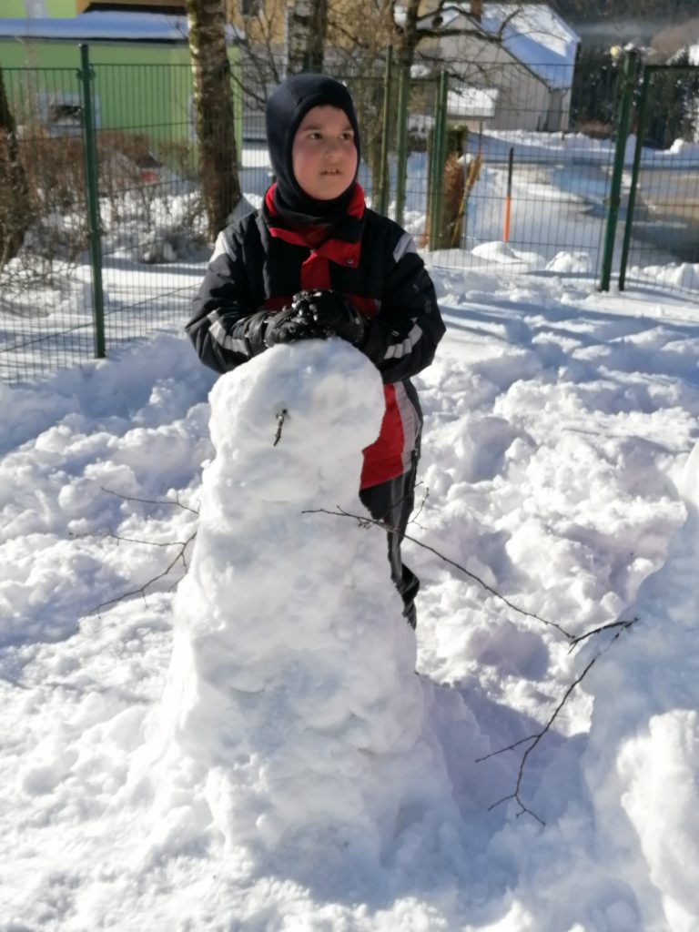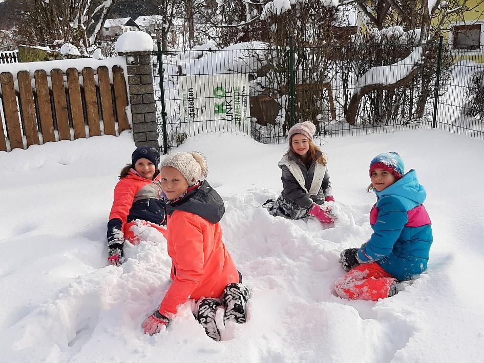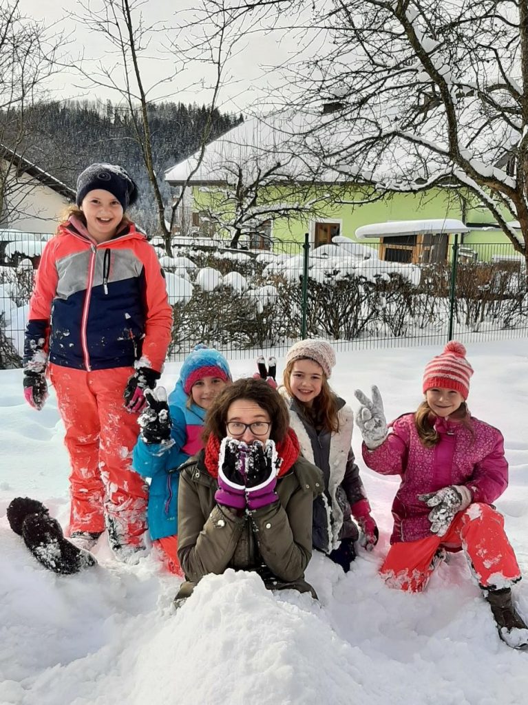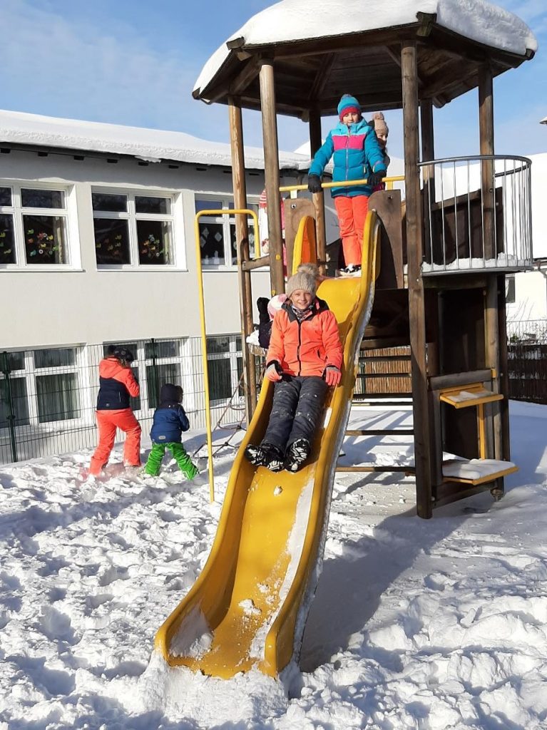 Die Kinder, die während des Distance Learning in der Schule betreut werden, freuen sich über die winterliche Schneepracht und können in einer Arbeitspause am Spielplatz toben!