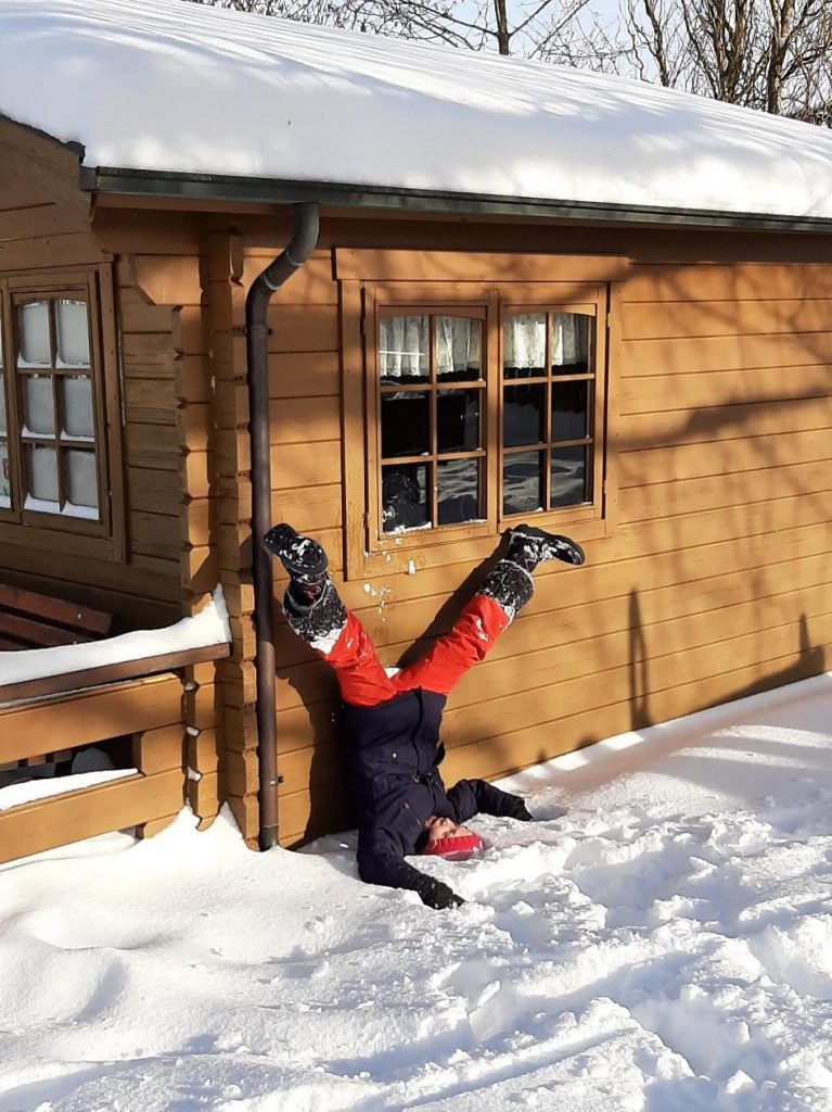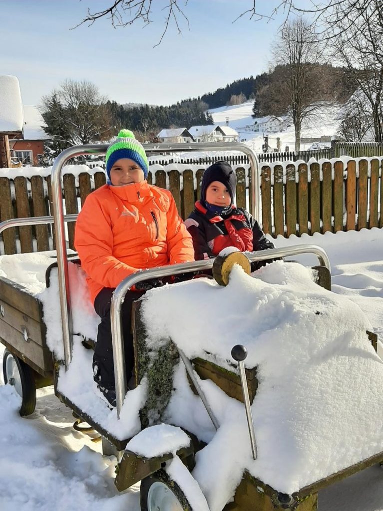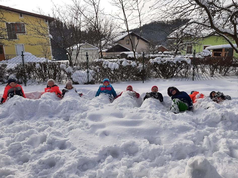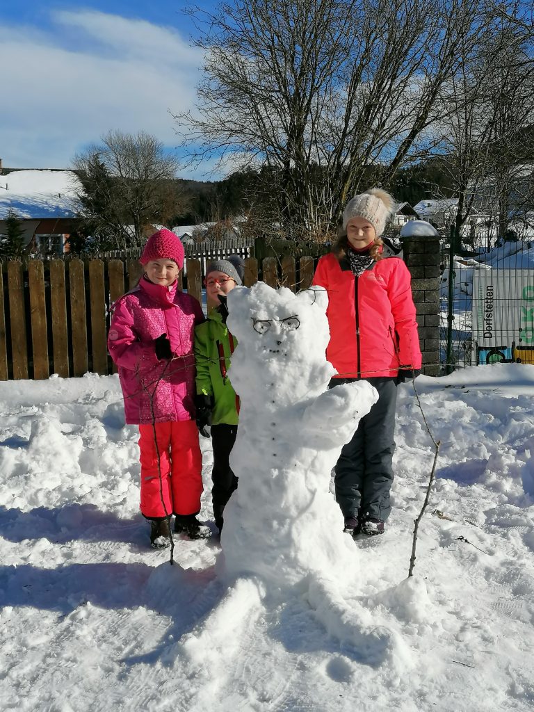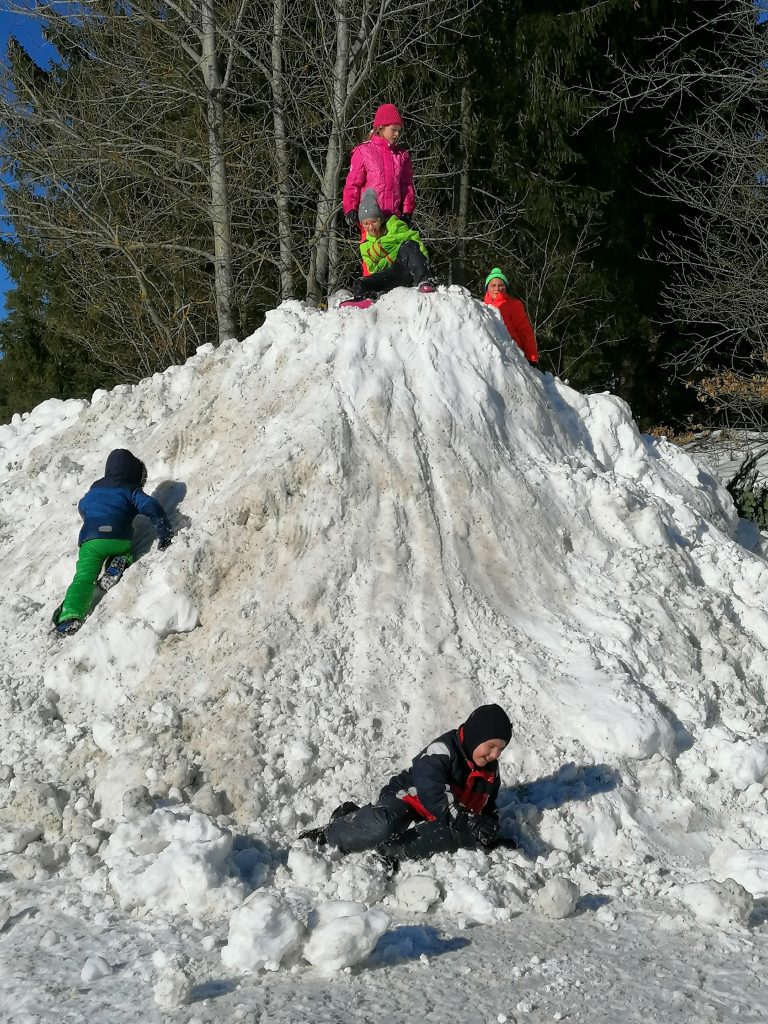 Die Kinder, die während des Distance Learning in der Schule betreut werden, freuen sich über die winterliche Schneepracht und können in einer Arbeitspause am Spielplatz toben!