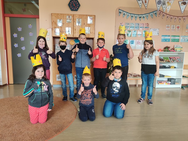 Unsere drei Erstklässler haben es geschafft. Alle Buchstaben sind gelernt und als Belohnung für den großen Fleiß der Kinder gab es ein Buchstabenfest. Es wurde an diesem Tag an verschiedenen Buchstabenstationen gearbeitet. Ein Buchstabenbaum und Buchstabenbrote wurden gemacht. Auch die 2. Klasse freut sich über den Abschluss des Erlernens der Schreibschriftbuchstaben und sie wurden ebenfalls mit einer Krone belohnt.