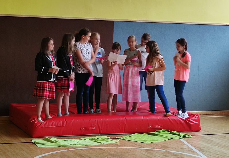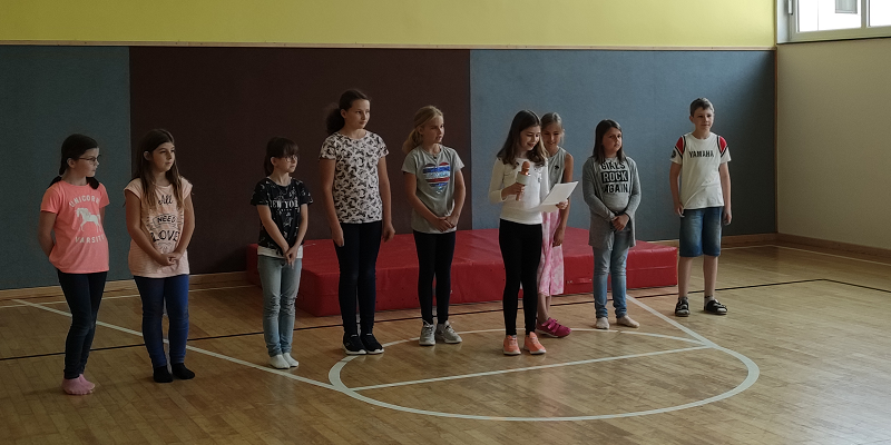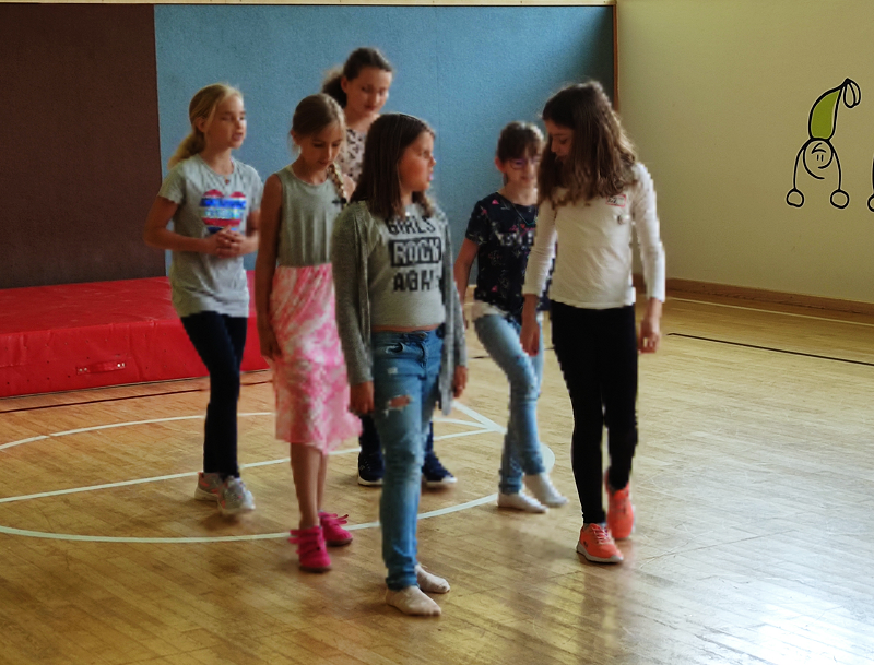 Einige Kinder der 2. Klasse hatten die Idee, eine eigene Sing-Tanz-Theatershow auf die Bühne zu bringen, und das ganz ohne Hilfe! Am 8. Juni war es so weit und sie präsentierten den Mitschülerinnen und Mitschülern Lieder, Tänze und einen Ausschnitt aus dem Buch „Hanni und Nanni“. Eine großartige Idee!