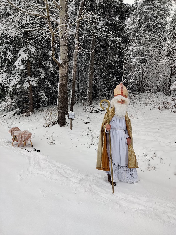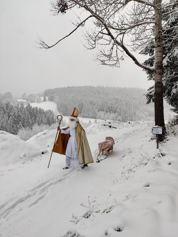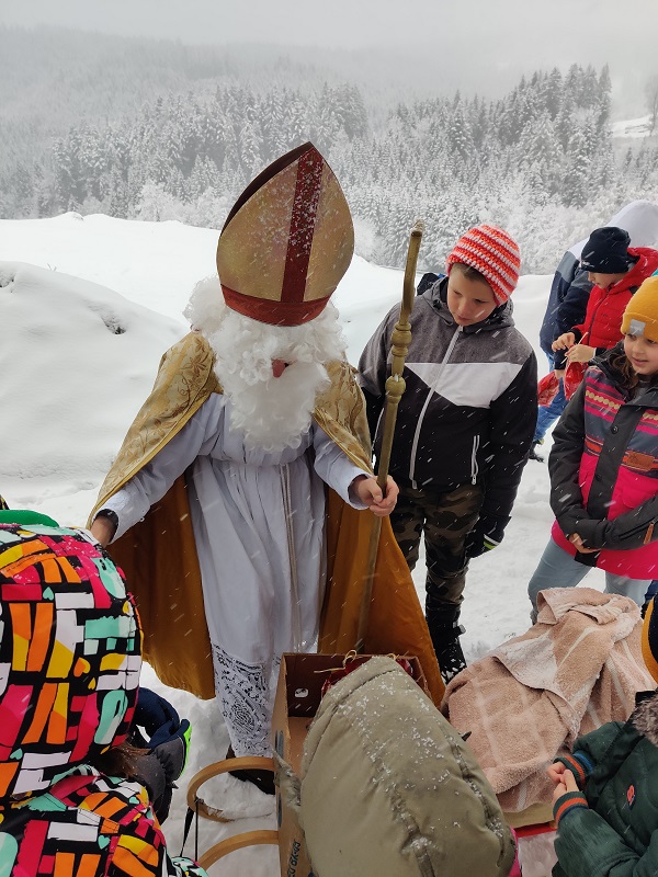 Am 6. Dezember durften die Kinder die zweite Stunde unerwartet früher beenden. Gemeinsam mit ihren Lehrerinnen gingen sie vor die Schule und bemerkten plötzlich eine Spur aus Tannenzweigen und Nüssen, die zum Kirchenparkplatz führte! Dort angekommen, stapfte uns plötzlich der Nikolaus mit seinem Schlitten durch den Schnee entgegen. Er erzählte den Kindern, was wirklich wichtig ist in der Adventzeit und generell immer – die Gemeinschaft, das Zusammensein, die gegenseitige Hilfe und Unterstützung! Anschließend bekam jedes Kind ein Gaben-Säckchen vom Nikolaus.