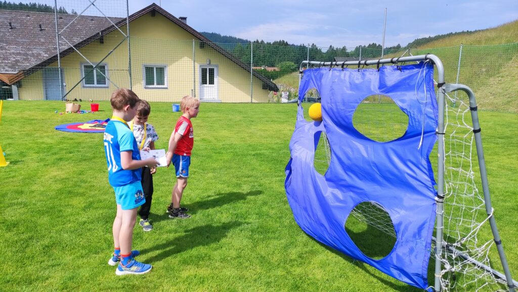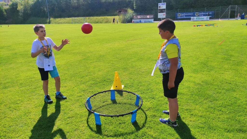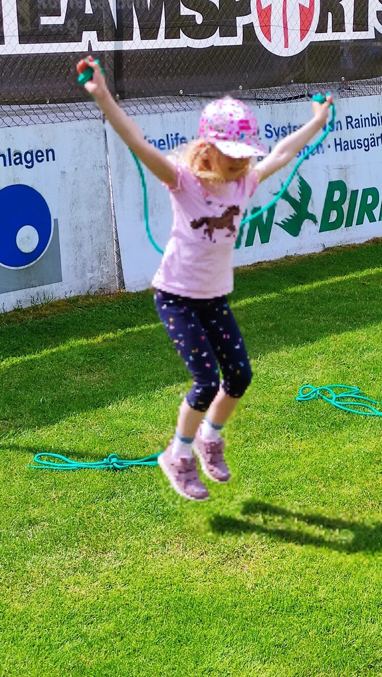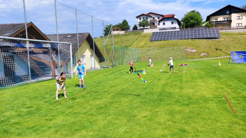 Am 19. Juni stand den ganzen Tag „Schwitzen“ am Stundenplan. Für unseren Sporttag hatten wir den Kindern das beste Wetter bestellt und so verbrachten wir bei strahlendem Sonnenschein drei Schulstunden am Sportplatz. Zunächst konnten die Kinder eine Gemeinschafts-Slackline überwinden. Diese war nicht wir üblich an zwei Seiten befestigt, sondern nur an einer. Damit die Slackline trotzdem funktionierte, halfen alle Kinder zusammen und hielten sie an Schlaufen in die Höhe! Danach tobten sich die Kinder an 8 Stationen aus. Mit dabei waren Geschicklichkeit, Weitwurf, Werfen und Fangen, verschiedenste Arten des Zielwerfens, eine Hüpf-und Springstation, ein Dreibeinlauf mit Partner, Seilspringen und ein Hockyspiel. Die Kinder konnten gar nicht genug bekommen und waren sehr motiviert, alle Stationen öfter zu machen.