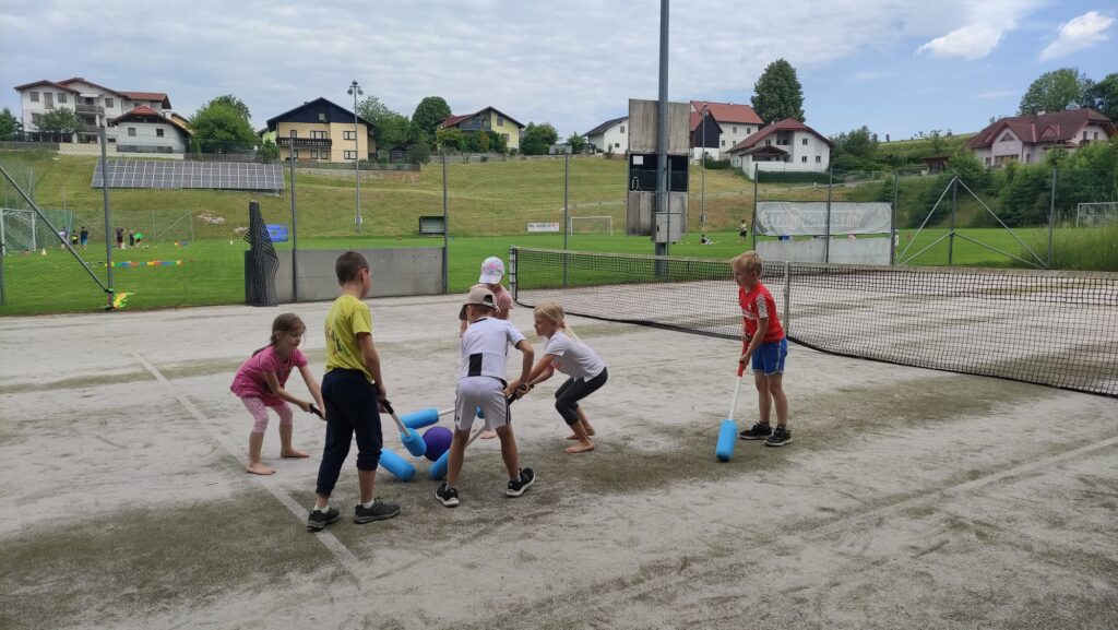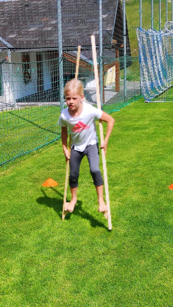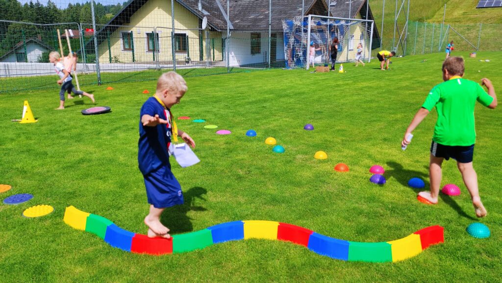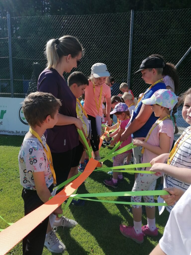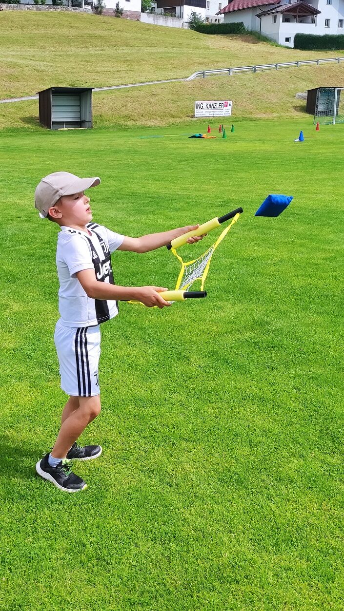 Am 19. Juni stand den ganzen Tag „Schwitzen“ am Stundenplan. Für unseren Sporttag hatten wir den Kindern das beste Wetter bestellt und so verbrachten wir bei strahlendem Sonnenschein drei Schulstunden am Sportplatz. Zunächst konnten die Kinder eine Gemeinschafts-Slackline überwinden. Diese war nicht wir üblich an zwei Seiten befestigt, sondern nur an einer. Damit die Slackline trotzdem funktionierte, halfen alle Kinder zusammen und hielten sie an Schlaufen in die Höhe! Danach tobten sich die Kinder an 8 Stationen aus. Mit dabei waren Geschicklichkeit, Weitwurf, Werfen und Fangen, verschiedenste Arten des Zielwerfens, eine Hüpf-und Springstation, ein Dreibeinlauf mit Partner, Seilspringen und ein Hockyspiel. Die Kinder konnten gar nicht genug bekommen und waren sehr motiviert, alle Stationen öfter zu machen.