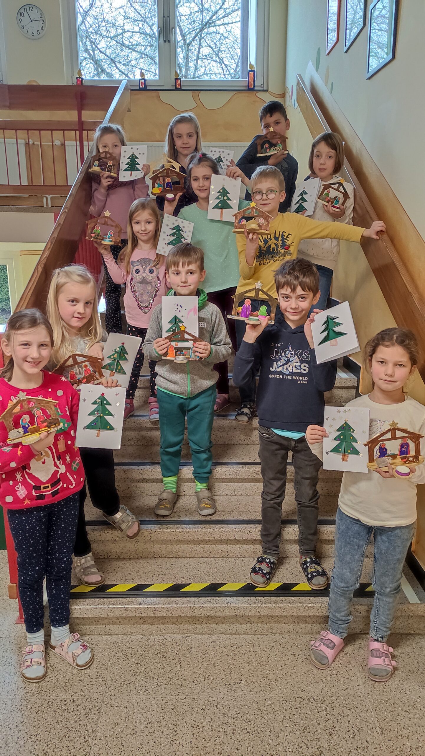 Für ihre Lieben haben die Kinder auch dieses Jahr wieder schöne Werkstücke im Unterricht gestaltet. Die erste Klasse bastelte eine Steckkrippe und eine Karte mit einem Christbaum und die zweite Klasse gestaltete eine Kerze aus Holz und dazu passend eine Karte.