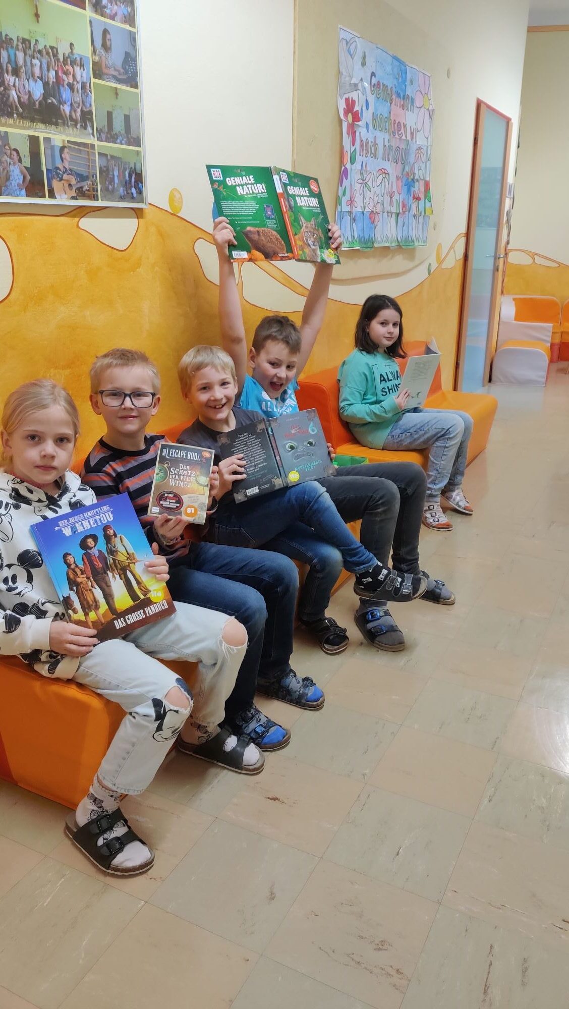 In der letzten Februarwoche hatten die Schülerinnen und Schüler die Möglichkeit, Bücher über die Firma „Lesewelten“ zu bestellen. Dazu wurden die Bücher an die Schule geschickt und bei uns eine Woche lang ausgestellt. Die Kinder bekamen jeden Tag Ausschnitte aus den Büchern vorgelesen und hatten Zeit zu schmökern. Natürlich gab es die Möglichkeit, sein liebstes Buch zu bestellen, doch besonders toll an dieser Aktion ist es, dass die Schule alle Bücher der Ausstellung für die Bibliothek behalten darf und so die Kinder noch mehr davon haben!