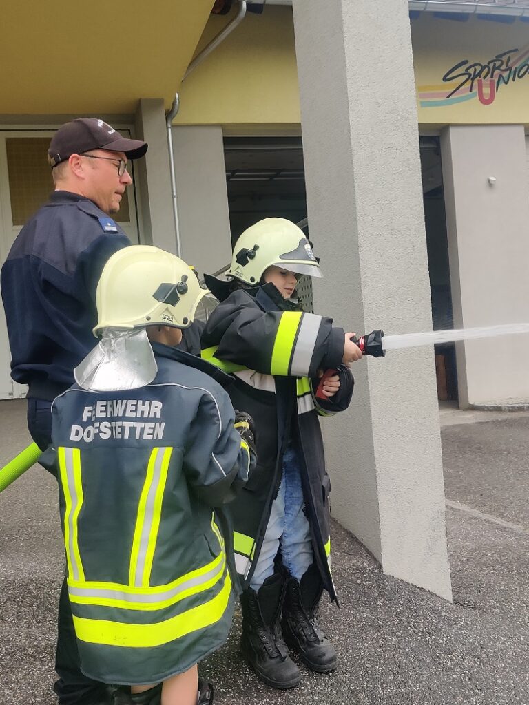 Am 24.05.2024 besuchten sie deshalb die Freiwillige Feuerwehr Dorfstetten. Die Kinder bekamen einen Einblick, welche Ausrüstungsgegenstände die Feuerwehr benötigt und konnten die Einsatzbekleidung auch gleich anprobieren. Sie durften das hydraulische Rettungsgerät bedienen und das Löschen mit dem Strahlrohr machte ihnen großen Spaß. Ein weiteres Highlight des Besuches war die Fahrt im Feuerwehrauto.
