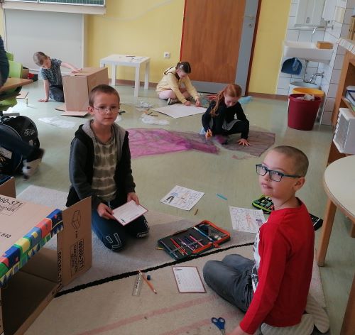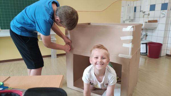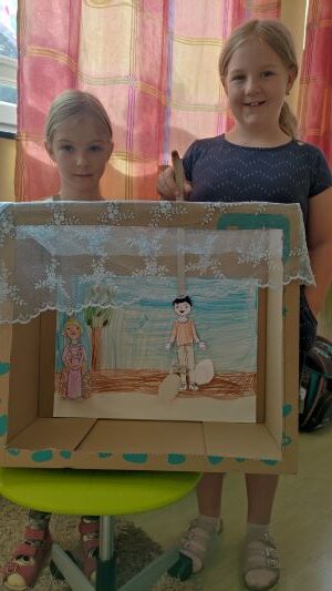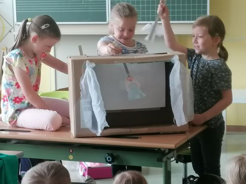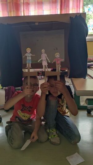 Am Montag, den 10.6.2024, stand der Vormittag ganz im Zeichen der Kreativität der Kinder. In Kleingruppen sollten sie ein kleines Theaterstück mit Stabpuppen darstellen. Dazu bastelten sie ihre eigenen Bühnen und auch Stabpuppen. Über den Ideenreichtum der Kinder konnten wir dabei wirklich nur staunen. Sie schrieben teilweise sogar ihre eigenen Theaterstücke. Den ganzen Vormittag bastelten und probten sie mit vollem Eifer. Dabei arbeiteten sie hervorragend zusammen.