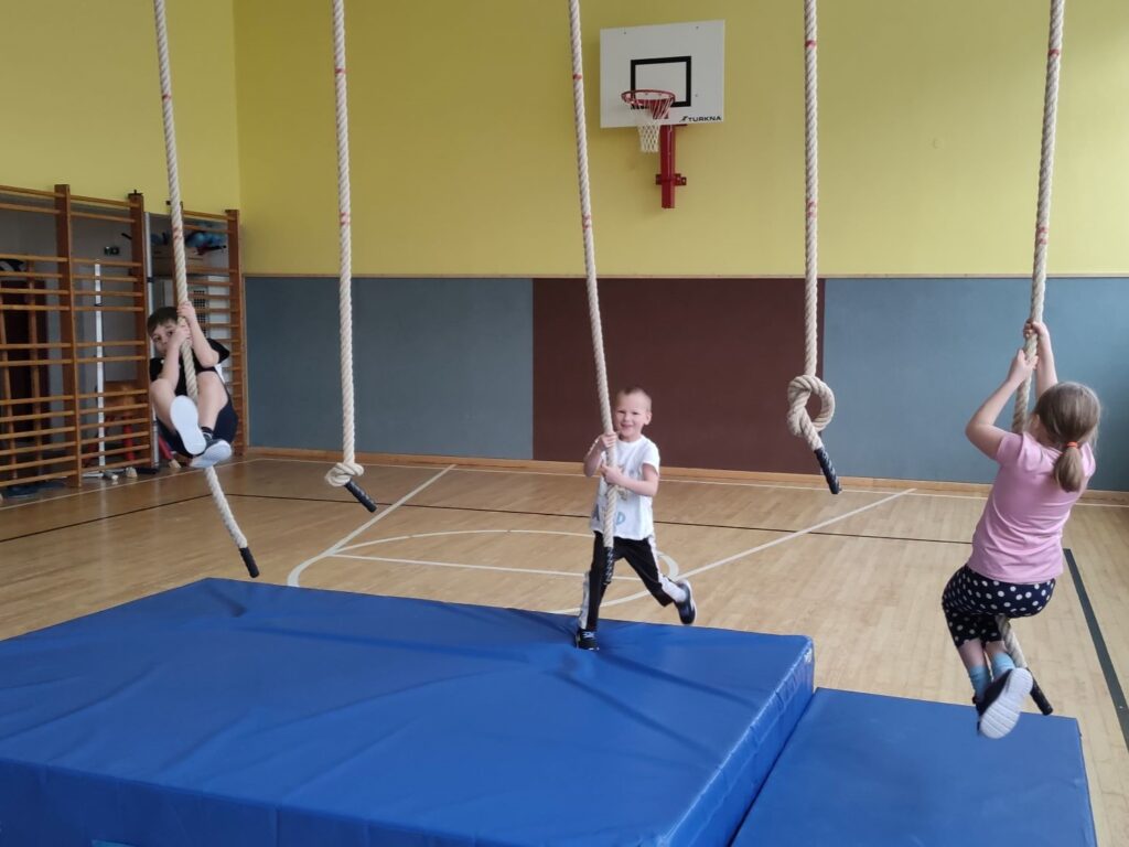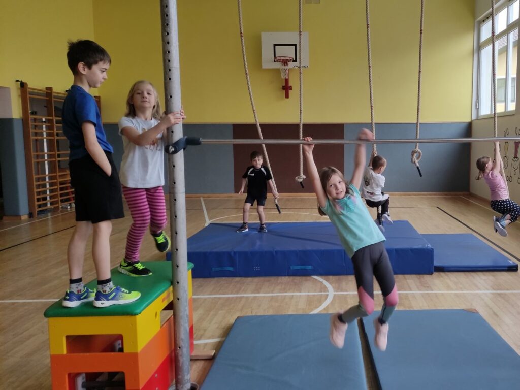 Die erste Klasse hatte im Jänner eine Turnstunde zum Thema „Klettern und Hangeln“. Geklettert wurde auf der Sprossenleiter und der Gitterleiter, die Reckstange entlang sollten die Kinder sich hangeln und bei den Tauen und den Stangen konnten die Kinder sowohl klettern als sich auch einfach nur festklammern.