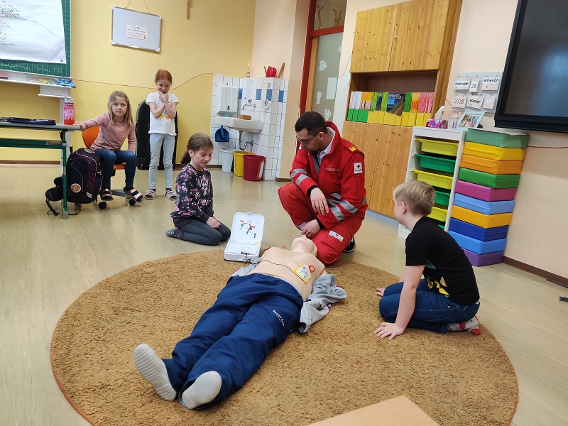 Ein besonderer Schwerpunkt lag auf der stabilen Seitenlage und der Reanimation. Die Kinder durften an einer Puppe üben und erhielten wertvolle Tipps, die im Ernstfall lebensrettend sein können.