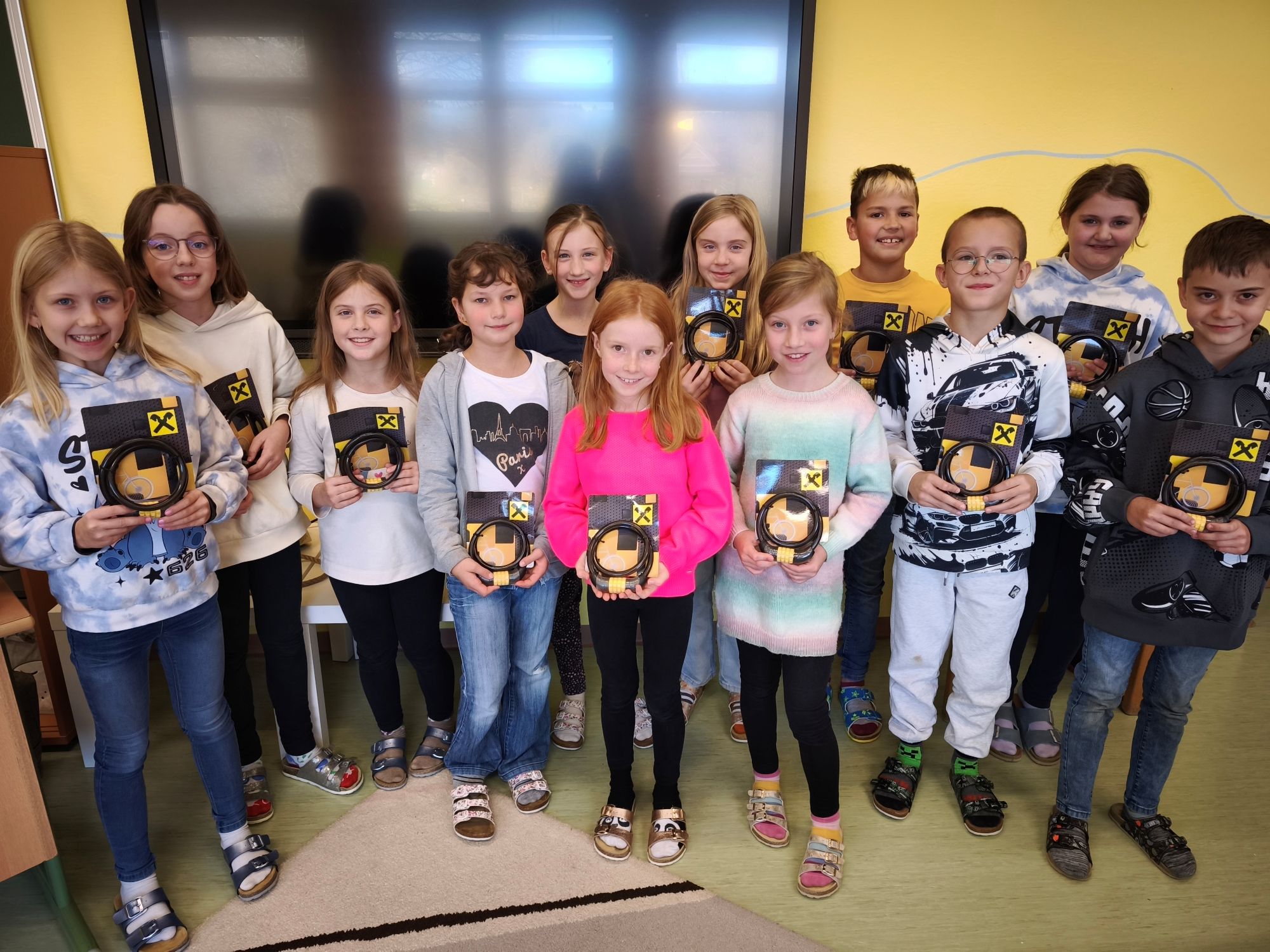 Auch die Raiffeisenbank gratuliert unseren Schülerinnen und Schülern zur bestandenen Radfahrprüfung und schickt als kleines Präsent für jedes Kind ein Fahrradschloss!
